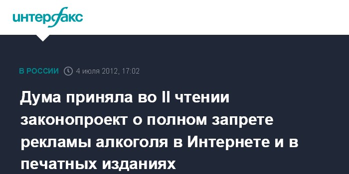Москва. 4 июля. INTERFAX.RU - Госдума на пленарном заседании в среду приняла во втором чтении законопроект о полном запрете рекламы алкогольной продукции как в Интернете, так и в периодических печатных изданиях.