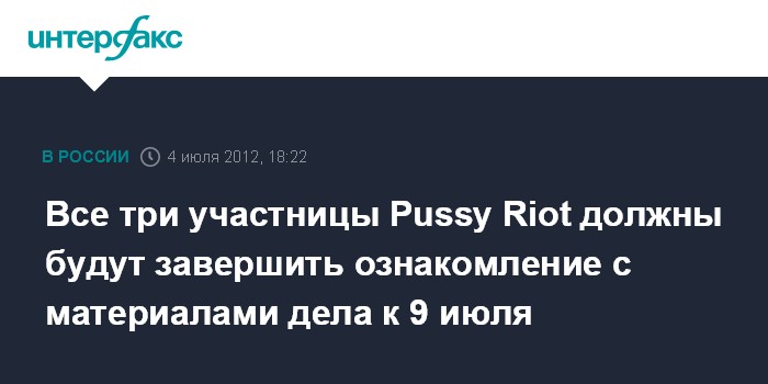 Москва. 3 июля. INTERFAX.RU - Таганский суд Москвы ограничил всех троих участниц группы Pussy Riot и их защиту в сроках ознакомления с материалами дела до 9 июля.