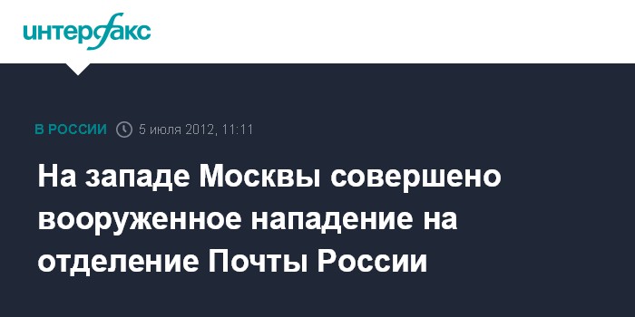 Москва. 5 июля. INTERFAX.RU - На западе Москвы по адресу: ул.Удальцова, д.14 совершено вооруженное разбойное нападение на отделение Почты России.