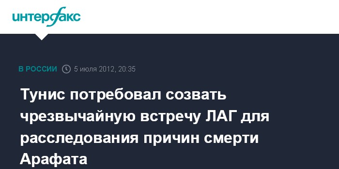 Тунис. 5 июля. INTERFAX.RU - Тунис требует созыва чрезвычайной встречи Лиги арабских государств для того, чтобы дать оценку расследованию телеканала "Аль-Джазира" относительно возможных причин смерти бывшего палестинского лидера Ясира Арафата, заявил в четверг глава МИД Туниса Рафик Абдессалем.