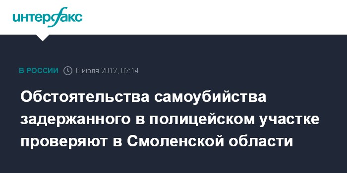 "В четверг в 14 часов в помещении пункта полиции в поселке Угра покончил жизнь самоубийством местный житель, доставленный туда участковым за появление в общественном месте в состоянии алкогольного опьянения (статья 20.21 КоАП)", - сообщил представитель управления.