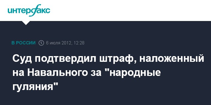 Москва. 6 июля. INTERFAX.RU - Басманный суд Москвы признал законным административный штраф в размере 1 тыс. рублей блогеру Алексею Навальному за одну из первых акций в рамках стихийных "народных гуляний" - 8 мая, сообщил "Интерфаксу" представитель Навального юрист Константин Терехов.