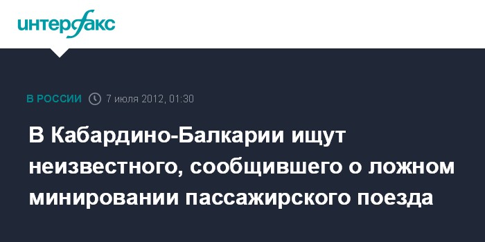 "Сигнал поступил по станции "Прохладная" в отделение транспортной полиции. Неизвестный сообщил, о том, что проводник одного из вагонов перевозит самодельную бомбу. Пассажиры были эвакуированы. Состав проверили саперы-взрывотехники, которые определили, что вызов был ложный", - сообщили "Интерфаксу" в субботу в правоохранительных органах КБР.