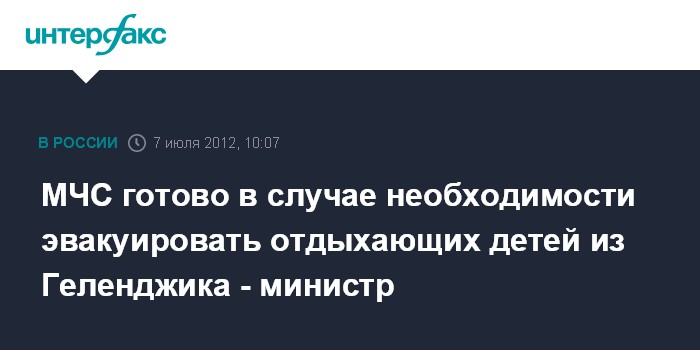 Москва. 7 июля. INTERFAX.RU - Глава МЧС Владимир Пучков заявил, что при необходимости будет организована эвакуация детей, отдыхающих в летних лагерях в Геленджикском районе Кубани. "Все, что касается домов отдыха, пансионатов, детских лагерей, - это забота первой необходимости. Если понадобится организовать эвакуацию детей, организуем быстро и оперативно", - отметил он.