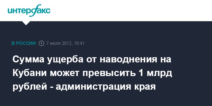 Ростов-на-Дону. 7 июля. INTERFAX.RU - В Геленджике прошло совещание оперативного штаба, где названа сумма ущерба от наводнения в Краснодарском крае. Губернатор Александр Ткачев заявил о выплате компенсаций пострадавшим. "Как подчеркивалось на совещании оперативного штаба, сумма ущерба может превысить 1 млрд руб. При этом полпред президент РФ в ЮФО Владимир Устинов отметил, что потери могут быть и выше, учитывая масштабы бедствия", - сообщили агентству "Интерфакс-Юг" в субботу в пресс-службе администрации Краснодарского края.