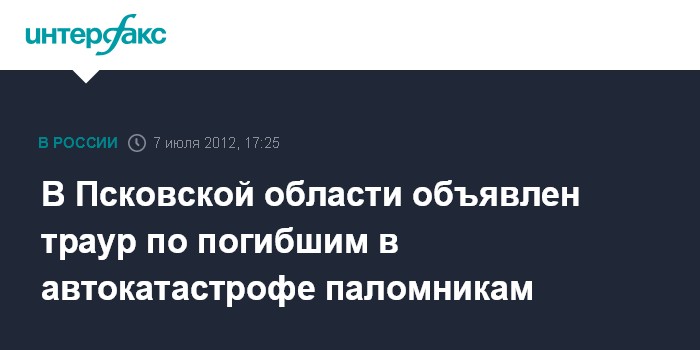 Псков. 7 июля. INTERFAX.RU - В Псковской области объявлен трехдневный траур по погибшим в автокатастрофе под Черниговом (Украина) паломникам из Великих Лук. Как сообщает пресс-служба региональной администрации, соответствующее постановление подписал губернатор Андрей Турчак. В дни траура - с 9 по 11 июля - в области будут приспущены государственные флаги, а также отменены все развлекательные передачи и мероприятия.
