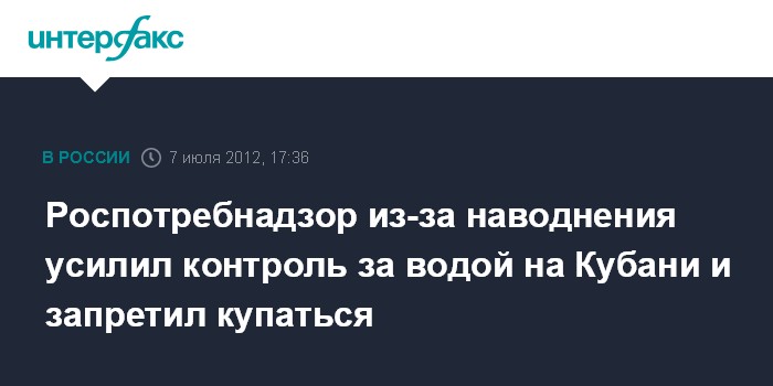Москва. 7 июля. INTERFAX.RU - Российская санитарная служба усилила контроль за качеством воды в районах Краснодарского края, пострадавших от наводнения. "Введен режим гиперхлорирования питьевой воды. Увеличена кратность проведения лабораторных исследований воды, производственного лабораторного контроля остаточного хлора в воде", - сообщили "Интерфаксу" в субботу в пресс-службе Роспотребнадзора. "Дано указание о запрете купания до получения удовлетворительных результатов лабораторных исследований воды", - заявили в ведомстве.