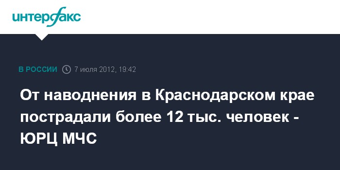 Ростов-на-Дону. 7 июля. ИНТЕРФАКС-ЮГ - По данным на 18:00, среди пострадавших от наводнения в Краснодарском крае числятся 12 тыс. 304 человека, сообщили агентству "Интерфакс-Юг" в субботу в Южном региональном центре МЧС РФ.