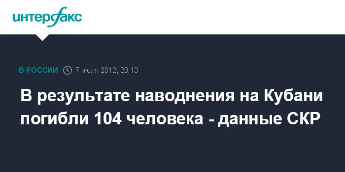 Краснодар. 7 июля. ИНТЕРФАКС - По последним данным, 104 человека стали жертвами наводнения в трех районах Краснодарского края, сообщил агентству "Интерфакс-Юг" старший помощник руководителя следственного управления СК РФ по региону Иван Сенгеров.
