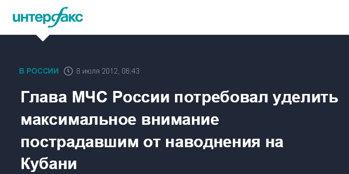 Геленджик. 8 июля. ИНТЕРФАКС - Глава МЧС России Владимир Пучков потребовал уделить внимание каждым улице и дому, пострадавшим от наводнения на Кубани.