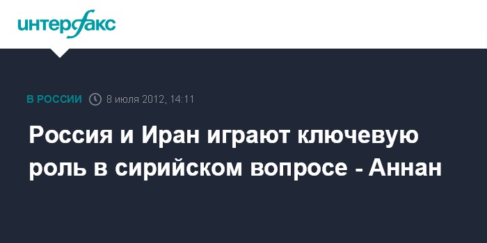 Париж. 8 июля. INTERFAX.RU - Россия и Иран являются важными странами в сирийской проблеме и могут сыграть ключевую роль, считает спецпосланник ООН и ЛАГ по Сирии Кофи Аннан. "Россия имеет подавляющее влияние (на сирийские власти - ИФ), но я не уверен, что события определяются ею одной (…). Иран - тоже игрок, Он должен стать часть решения проблемы. Он имеет влияние (в Сирии - ИФ), и мы не должны это игнорировать", - сказал он в интервью газете "Монд".