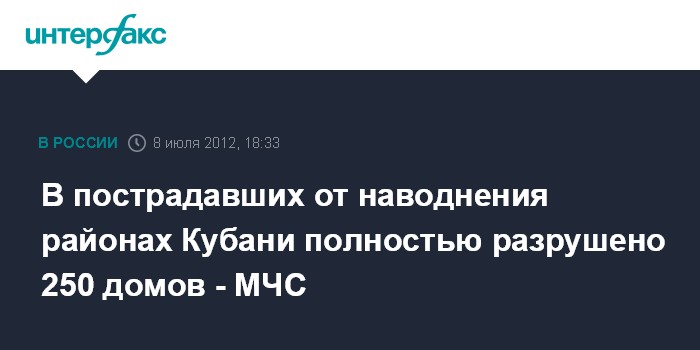 Ростов-на-Дону. 8 июля. INTERFAX.RU - По данным на вечер воскресенья, в пострадавших от наводнения районах Кубани пострадали почти 3 тыс. домов, из них 254 разрушены полностью, сообщили агентству "Интерфакс-Юг" в воскресенье в Южном региональном центре МЧС РФ. "При этом около 3300 человек полностью утратили свое имущество, а более 18 тыс. - частично", - сказал собеседник агентства. В Крымске, Неберджаевской и Нижебаканской станицах частично нарушено газо- и электроснабжение.