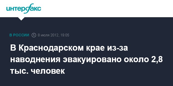Краснодар. 8 июля. INTERFAX.RU - Около 2,8 тыс. человек эвакуировано из зоны наводнения в Краснодарском крае, всего оказались подтопленными в трех городах и четырех небольших населенных пунктах 5,2 тыс. домов, сообщили агентству "Интерфакс-Юг" в пресс-службе ГУ МЧС РФ по региону. "Подтоплено 5185 домов, 2035 придворовых территорий с населением 26475 человек, из них 6330 детей. Всего эвакуировано в места временного размещения 2756 человек, из них 126 детей", - сказали в пресс-службе.