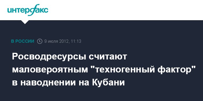 Москва. 9 июля. INTERFAX.RU - Причиной разрушительного наводнения в Крымске, по предварительным дынным, стали сильные дожди, техногенный фактор маловероятен, считает заместитель руководителя Федерального агентства водных ресурсов (Росводресурсы) Вадим Никаноров.