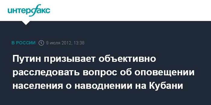 Москва. 9 июля. INTERFAX.RU - Президент России Владимир Путин поручает объективно расследовать, как было организовано на Кубани оповещение о возможном бедствии, определить, как работали все службы.