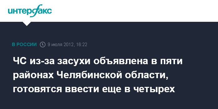 Режим чрезвычайной ситуации из-за летней засухи, повлекшей гибель посевов, объявили Брединский, Агаповский, Кизильский, Октябрьский и Карталинский районы области. Готовятся объявить такой режим также Верхнеуральский, Нагайбакский, Троицкий и Чесменский районы.
