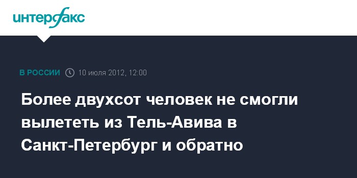 В результате отмены рейса Тель-Авив - Санкт-Петербург - Тель-Авив из Израиля в Россию и в обратном направлении не смогли вылететь около 250 человек, сообщил собеседник агентства. Из Тель-Авива самолет должен был прибыть 9 июля в 23.55, а отправиться из Санкт-Петербурга - 10 июля в 01.05.