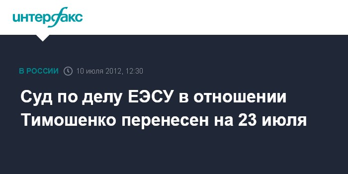 Харьков. 10 июля. INTERFAX.RU - В судебных заседаниях по делу о финансовых нарушениях корпорации "Единые энергетические системы Украины" (ЕЭСУ) в отношении экс-премьера Юлии Тимошенко объявлен перерыв до 10.00 23 июля.