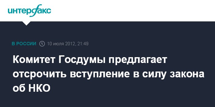 Москва. 10 июля. ИНТЕРФАКС - Профильный комитет Госдумы предлагает отсрочить вступление в силу законопроекта об НКО-"иностранных агентах" на месяц, а также исключить из него положение об административной ответственности, чтобы внести их отдельным законопроектом в среду.