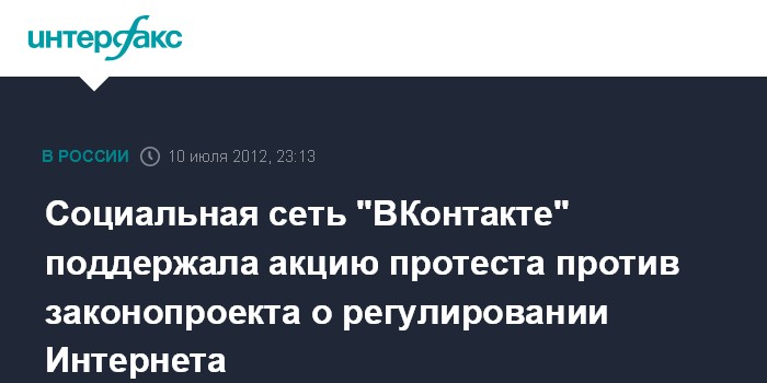 Москва. 11 июля. INTERFAX.RU - Социальная сеть "ВКонтакте" во вторник поддержала акцию протеста против находящегося на рассмотрении в Госдуме законопроекта №89417-6 "О внесении изменений в Федеральный закон "О защите детей от информации, причиняющей вред их здоровью и развитию" и отдельные законодательные акты РФ".