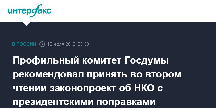 Москва. 10 июля. INTERFAX.RU - Профильный комитет Госдумы рекомендовал принять во втором чтении законопроект об НКО-"иностранных агентах" с учетом предложений президента РФ, поступивших в Госдуму вечером во вторник.