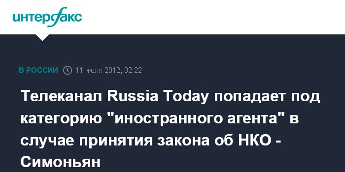 Телеканал Russia Today попадает под категорию "иностранного агента" в случае принятия закона об НКО - Симоньян