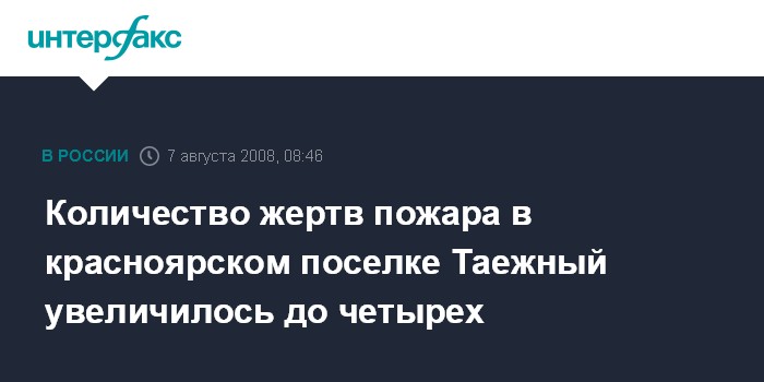 Москва. 7 августа. INTERFAX.RU - В результате пожара в поселке Таежный Богучанского района Красноярского края погибло четыре человека: два тела - взрослого и двухлетнего ребенка - нашли сразу, еще двоих обнаружили после разбора завалов.