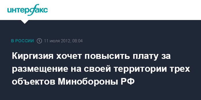 Он уточнил, что речь идет о повышении арендной платы за три военных объекта, которые находятся на киргизской территории, - испытательной базе противолодочных вооружений ВМФ РФ, 338 узле связи ВМФ РФ и сейсмическом пункте службы спецконтроля Минобороны РФ.