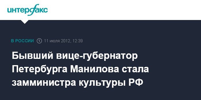 Москва. 11 июля. INTERFAX.RU - Алла Манилова, до 2011 года занимавшая пост вице-губернатора Санкт-Петербурга, назначена заместителем министра культуры РФ.