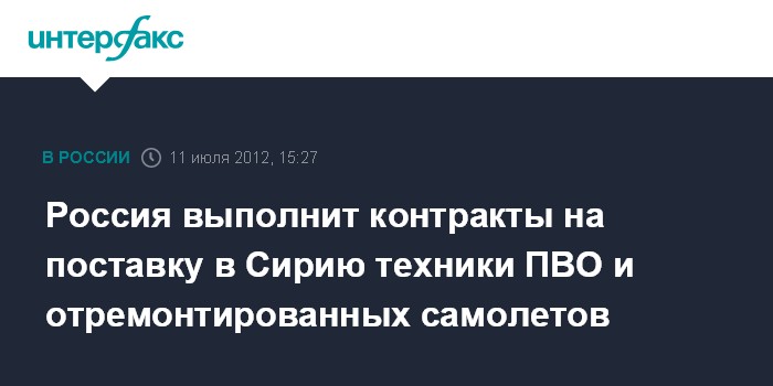 Фарнборо. 11 июля. INTERFAX.RU - Россия будет выполнять ранее заключенные контракты на поставку в Сирию техники ПВО и отремонтированных самолетов, заявил журналистам заместитель директора Федеральной службы по военно-техническому сотрудничеству Вячеслав Дзиркалн.