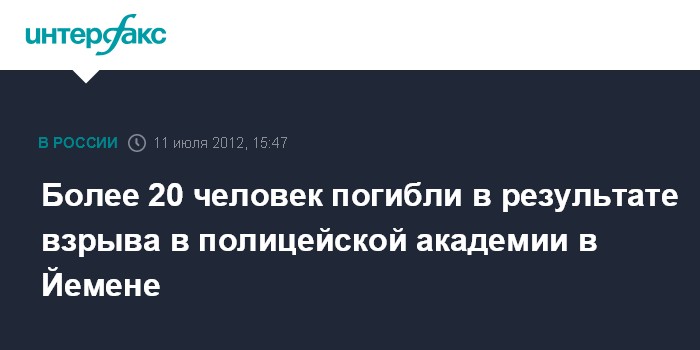 Дубай. 11 июля. INTERFAX.RU - По меньшей мере 22 человека погибли в результате сильного взрыва в здании полицейской академии в столице Йемена Сане, сообщает местная полиция.