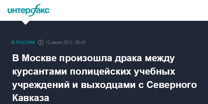 Москва. 12 июля. ИНТЕРФАКС - Драка между будущими полицейскими и выходцами с Северного Кавказа произошла в Москве, сообщил "Интерфаксу" источник в правоохранительных органах.