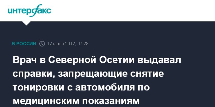 В пресс-службе МВД республики агентству "Интерфакс - Юг" сообщили, что пресечена незаконная деятельность одного из врачей кожно-венерологического диспансера Владикавказа, который за 3 тыс. рублей выписывал справки автомобилистам с диагнозом фотодерматоз - непереносимость солнечного света. По его задумке такая справка должна была освобождать автовладельца от снятия тонировки с автомобиля.