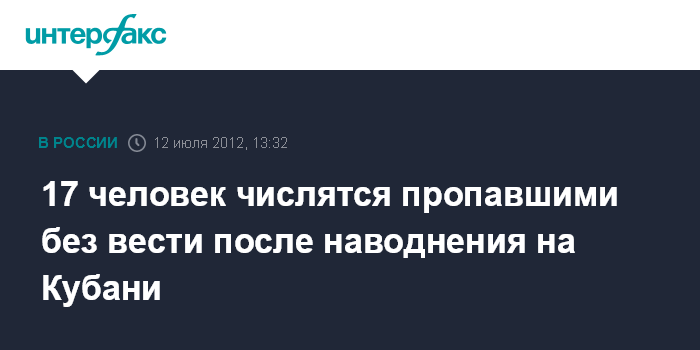 Москва. 12 июля. INTERFAX.RU - В списках пропавших без вести после наводнения на Кубани числятся 17 человек, заявил журналистам глава МЧС Владимир Пучков.