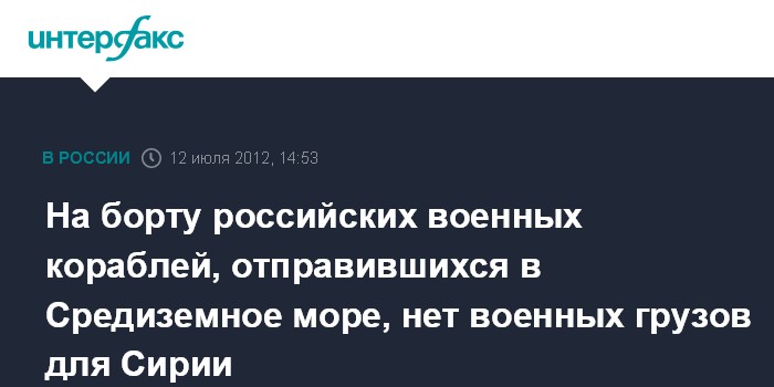 Москва. 12 июля. INTERFAX.RU - На борту кораблей ВМФ, которые отправились в Средиземное море на плановые учения, нет военных грузов, предназначенных для поставки в Сирию, сообщил "Интерфаксу-АВН" в четверг военно-дипломатический источник.