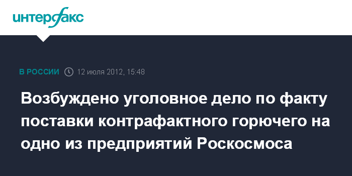 Москва. 12 июля. INTERFAX.RU - По результатам проверки, проведенной Генеральной прокуратурой России по заявлению руководителя Роскосмоса, возбуждено уголовное дело по факту поставки контрафактного горючего.