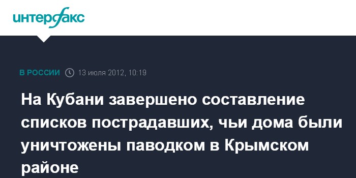 "Завершено составление списков пострадавших, чьи дома были уничтожены паводком. Сегодня утром начались встречи первого вице-губернатора Джамбулата Хатуова и вице-губернатора Ивана Перонко с жителями города Крымска и населенных пунктов Нижнебаканская, Неберджаевская, Адагумская, Новоукраинский, внесенными в списки потерявших жилье", - сообщает пресс-служба администрации Кубани.