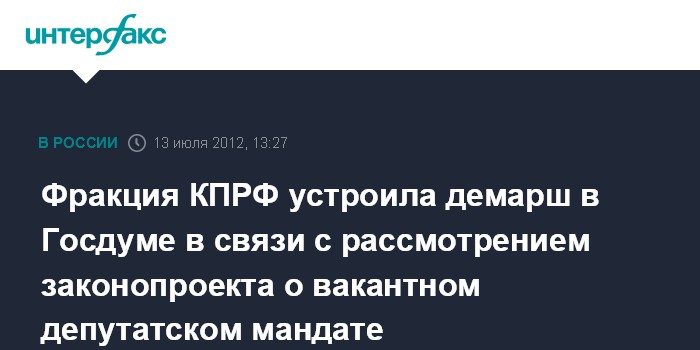 Как заявил с трибуны палаты первый замруководителя фракции КПРФ Сергей Решульский, депутаты трех оппозиционных фракций, просили перенести на осень законопроект о вакантном депутатском мандате, однако закон был рассмотрен в пятницу. "Мы не можем с этим согласиться и в полном составе покидаем заседание Госдумы", - сказал он.