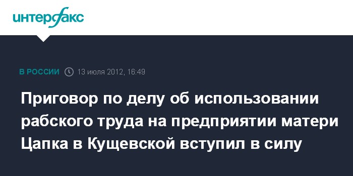 Приговор по делу об использовании рабского труда на предприятии матери Цапка в Кущевской вступил в силу