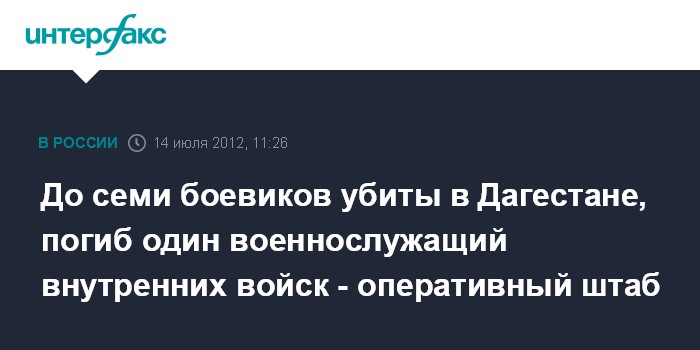 Махачкала. 14 июля. INTERFAX.RU - В боестолкновении у селения Утамыш на границе Каякентского и Сергокалинского районов Дагестана убиты до семи боевиков, погиб военнослужащих внутренних войск, сообщили "Интерфаксу" в оперативном штабе в республике Дагестан.