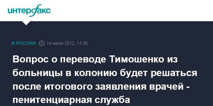 Киев. 14 июля. INTERFAX.RU - В Государственной пенитенциарной службе Украины опровергли заявление защитника экс-премьера Юлии Тимошенко Сергея Власенко о том, что его подзащитную намерены выписать из больницы и перевести в колонию, не закончив лечение, сообщается на сайте газеты "Сегодня". "Мы не подтверждаем ни одного слова из заявления Власенко. Сейчас вообще не обсуждается вопрос о переводе, пока не будет итогового заявления врачей", - сказал помощник главы Государственной пенитенциарной службы Игорь Андрушко.
