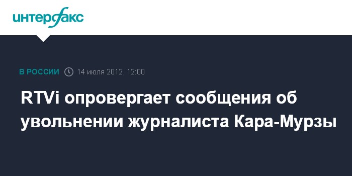 Москва. 14 июля. INTERFAX.RU - Журналист международного русскоязычного телеканала RTVi Владимир Кара-Мурза-младший, заявивший накануне о своем увольнении, не остался без работы, сообщает радиостанция "Эхо Москвы" в субботу со ссылкой на пресс-службу телеканала. "Журналист Владимир Кара-Мурза-младший уволен не был. Его репортажи, включая материалы о судьбе "закона Магнитского" на Капитолийском холме, ежедневно появляются в выпусках новостей и в итоговой аналитической программе "Эхо Недели"", - подчеркнули в пресс-службе.