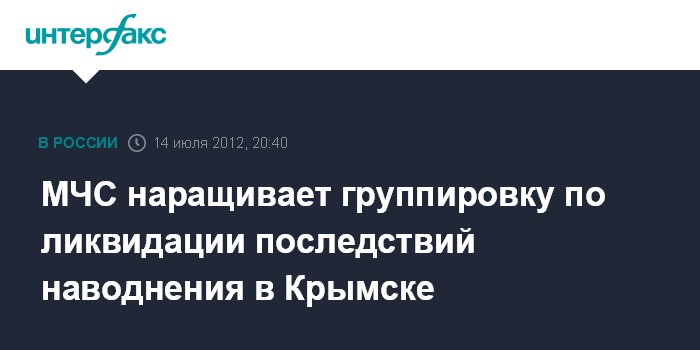 Москва. 14 июля. ИНТЕРФАКС - Директор департамента гражданской защиты МЧС России Сергей Диденко сообщил о наращивании группировки по ликвидации последствий наводнения в Крымске.