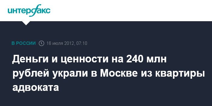 Москва. 16 июля. INTERFAX.RU - Из квартиры столичного адвоката вынесли деньги и драгоценности почти на четверть миллиарда рублей, сообщил "Интерфаксу" в понедельник источник в правоохранительных органах.