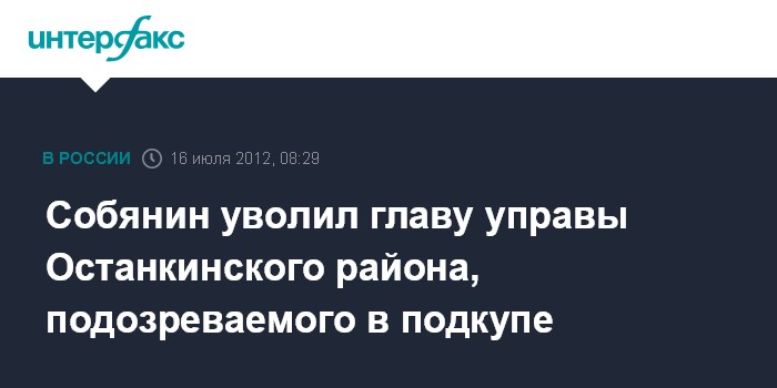 Собянин уволил главу управы Останкинского района, подозреваемого в подкупе
