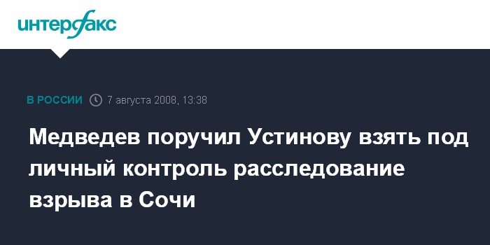 Москва. 7 августа. INTERFAX.RU - Президент России Дмитрий Медведев поручил своему полпреду в Южном федеральном округе лично контролировать расследование взрыва на пляже в Сочи.