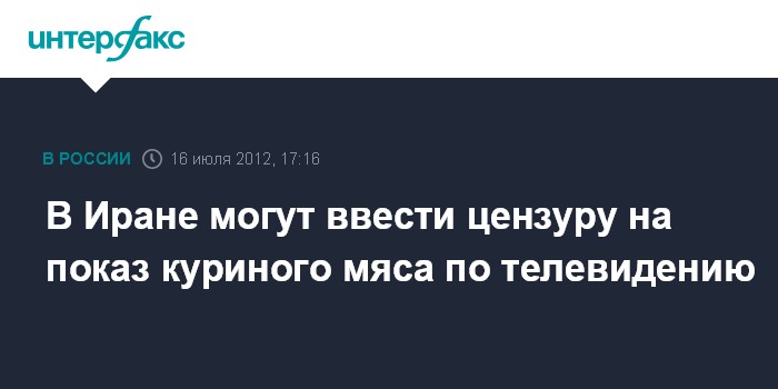 Тегеран. 16 июля. INTERFAX.RU - Сцены, в которых в фильмах демонстрируется, как герои едят курицу, нельзя показывать в эфире иранского телевидения, поскольку цена на куриное мясо в Иране резко возросла, сообщил командующий иранской полицией Исмаил Ахмади Мокаддам.
