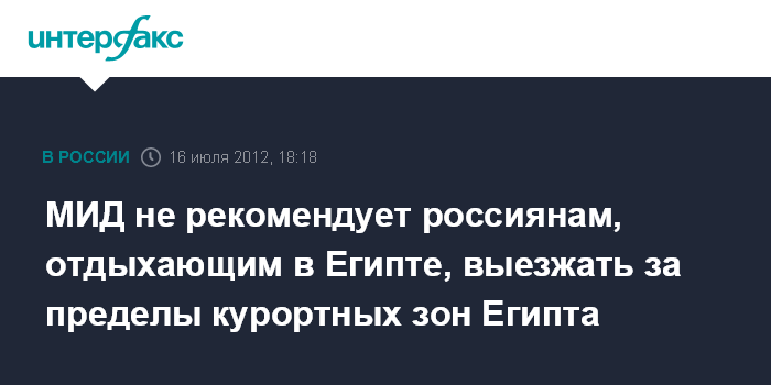 Москва. 16 июля. INTERFAX.RU - МИД РФ подтверждает рекомендацию россиянам воздерживаться от поездок за пределы курортных зон в Египте.