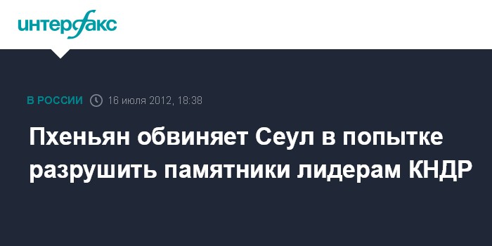 Сеул. 16 июля. INTERFAX.RU - Власти Северной Кореи обвинили Южную Корею и США в использовании северокорейских перебежчиков для проведения диверсионных операций по разрушению памятников лидерам КНДР. Соответствующее заявление Центрального телеграфного агентства Кореи распространено в понедельник по каналам северокорейских СМИ.