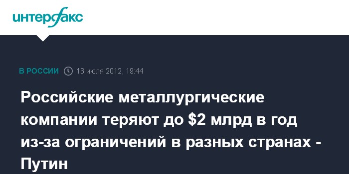 "В разных странах в отношении российской металлопродукции действует более 20 ограничительных мер, в том числе в США, странах ЕС, Мексике, Турции, Индонезии, Китае, Таиланде и, к сожалению, на Украине. Из-за этого наши компании ежегодно теряют от 1,5 до 2 млрд долларов", - заявил Путин на совещании по развитию черной металлургии.